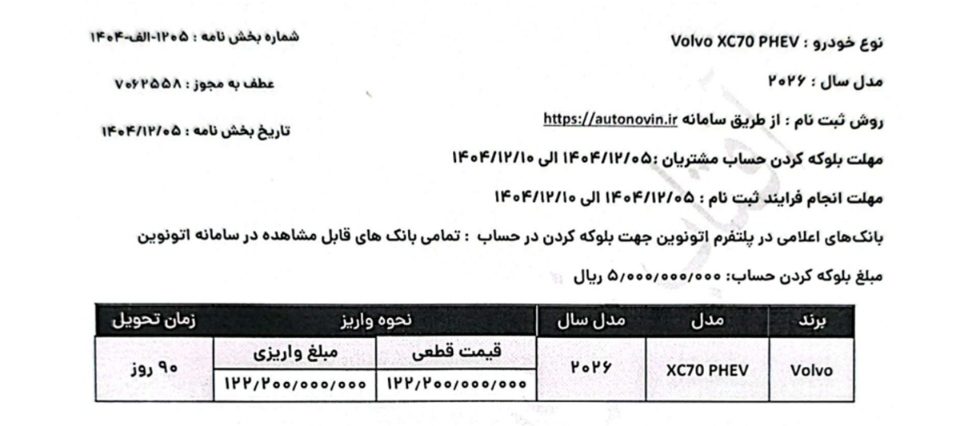 براساس بخشنامه ولوو XC70 مدل 2026 با قیمت قطعی 12,220,000,000 تومان با موعد تحویل 90 روزه عرضه خواهد شد. موعد تحویل خودرو مشروط به انجام کامل تعهدات متقاضی و واریز مبلغ پیش پرداخت در زمان مقرر خواهد بود.