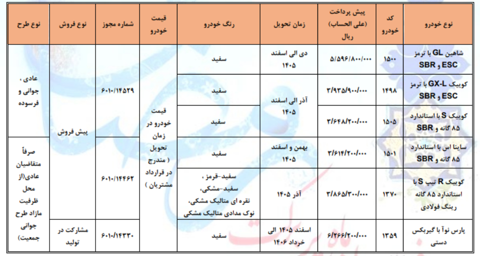 نوع خودرو | پیش پرداخت (ریال) | زمان تحویل | نوع طرح | قیمت خودرو | رنگ خودرو |